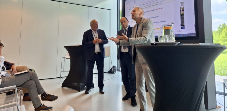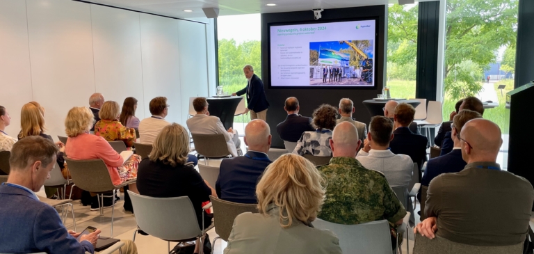 Het Waterkwartier in Nieuwegein was woensdagmiddag 25 juni 2025 het decor voor het bestuurlijk symposium ‘Veiligheid in de energietransitie’. Bestuurders, ondernemers, wetenschappers en beleidsmakers spraken met elkaar over de bestuurlijke dilemma’s rond de energietransitie. Dat het symposium plaatsvond op deze locatie was niet toevallig. Op 4 oktober 2024 werd daar een nieuwe waterstoftoepassing geopend door Koning Willem-Alexander: een (kleine) electrolyser die jaarlijks 300.000 kilo aan groene waterstof zal produceren. Een bezichtiging van de electrolyser, maar ook een rondleiding in het duurzaam ontworpen pand, was daarom ook onderdeel van het programma.