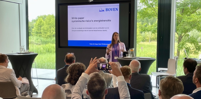 Tijdens het symposium besteedde BOVEN aandacht aan een oud risico dat met de energietransitie weer extra relevant wordt: de continuïteit van energievoorziening. BOVEN-lid en wethouder van Dordrecht Tanja de Jonge presenteerde eerste gedachten en mogelijke antwoordrichtingen die BOVEN in een white paper wil publiceren. Tot voor kort was dat risico een ver-van-mijn-bed-show voor lokaal bestuurders maar in de ‘wereld van B’ heeft het lokaal bestuur daar wel een taak. In die wereld streven we immers naar veel decentrale energievoorzieningen. Op dit moment heeft het energienetwerk één frequentie nodig dat met een ‘paar’ grote wisselstroomcentrales ‘makkelijk’ te realiseren is. In de wereld van B is er veel meer en veel meer gelijkstroom energieproductie nodig. Dus is de continuïteit nu ook een decentrale verantwoordelijkheid geworden? Immers decentrale energieproductie wordt door het decentraal openbaar bestuur vergund.
